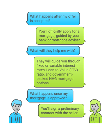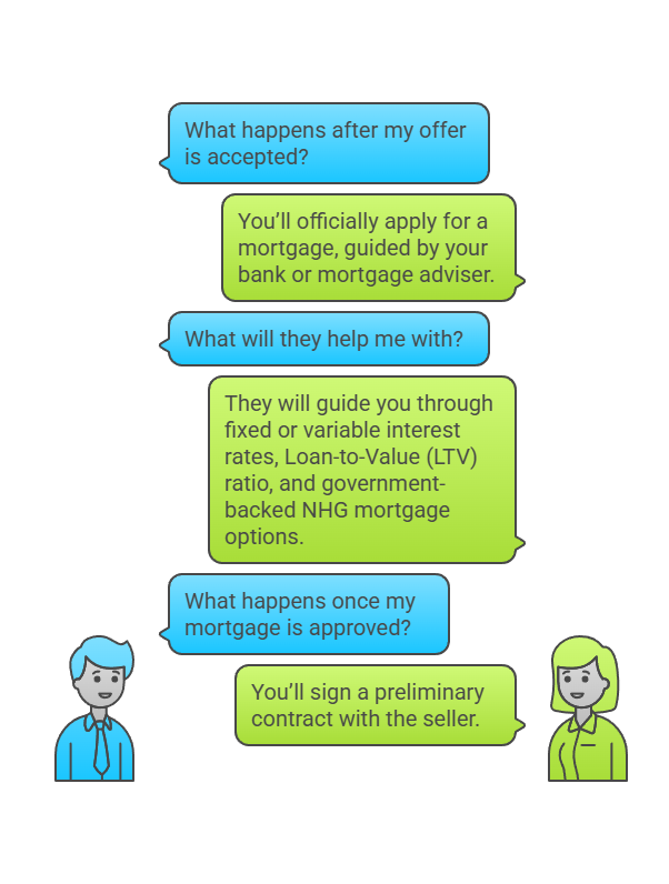 🏦 After your offer is accepted, you’ll officially apply for a mortgage (hypotheek). Your bank or mortgage adviser will guide you through: